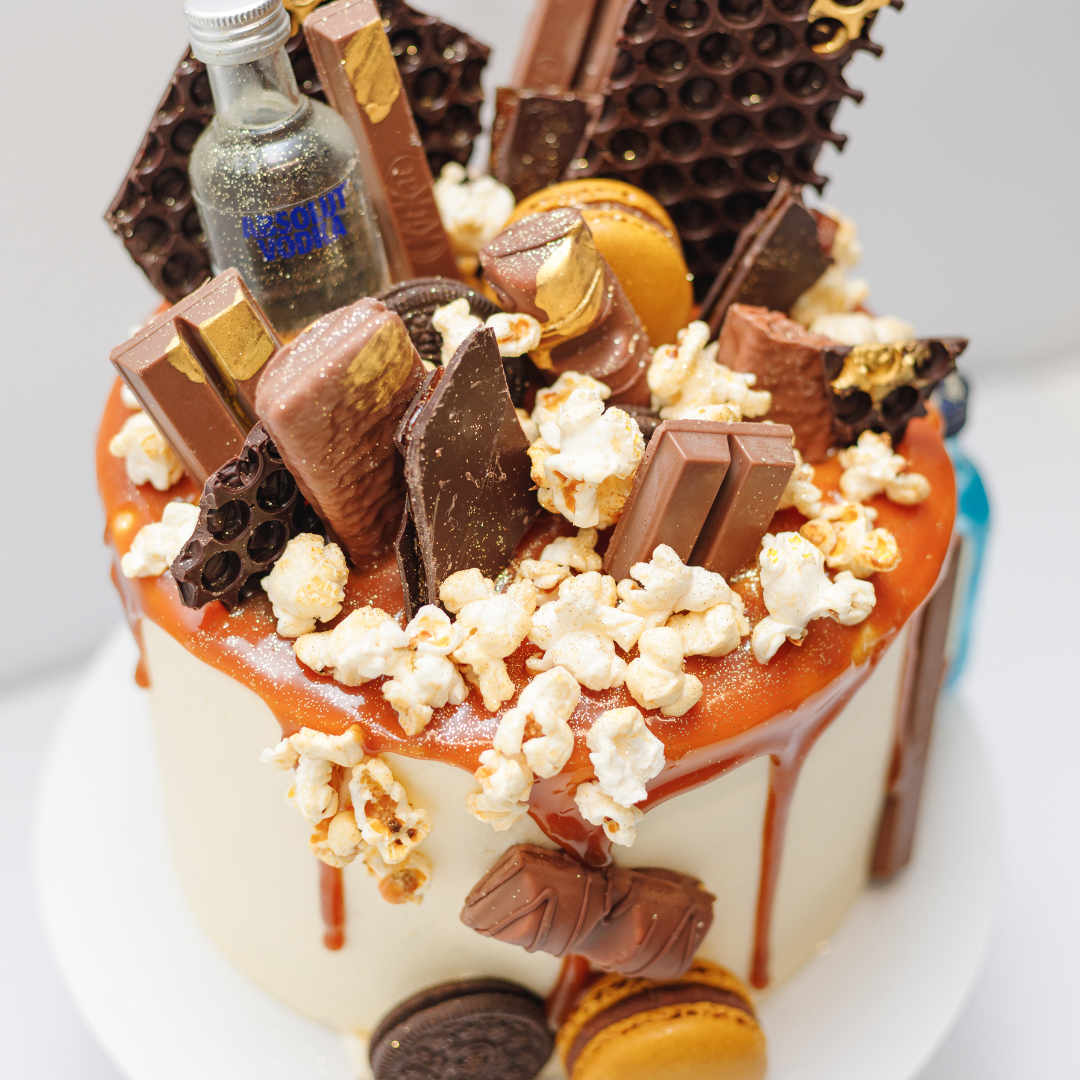 Our Scotch and Cake is a moist orange poppy seed cake filled with chocolate ganache and topped with an orange-infused buttercream frosting. We add a layer of Scotch whiskey-soaked sponge cake and some toasted oat crumble for a boozy finishing touch!