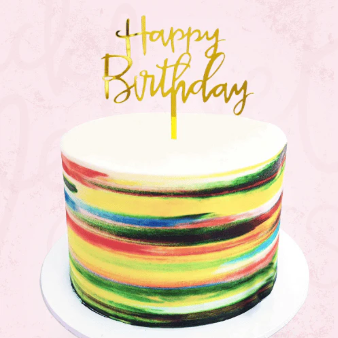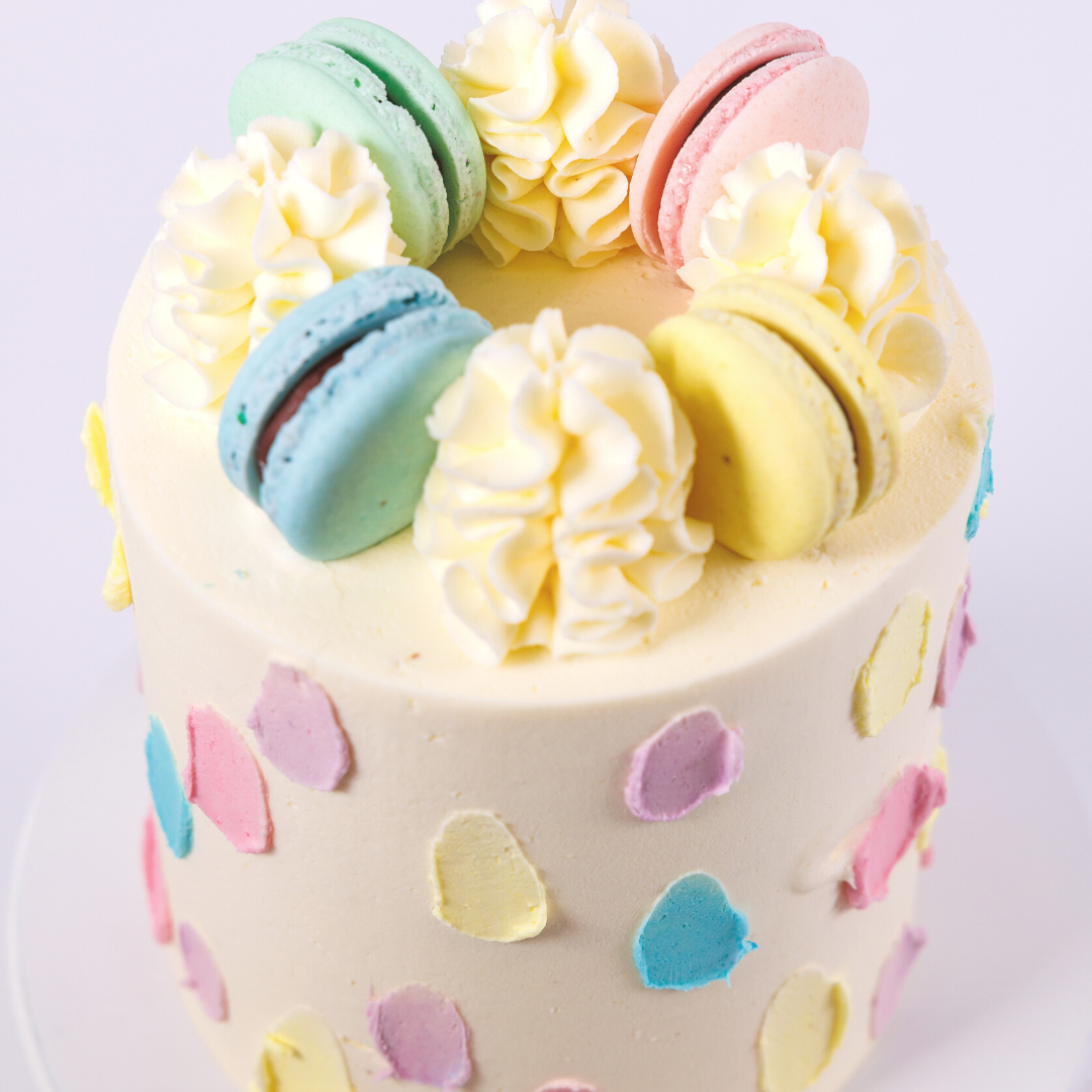 The Vegan Pastel Palette Painted Cake is an elegant and creative creation. This fondant cake is hand-decorated with bright and pale buttercream colours. It is adorned with delicate soft shades of macarons and ivory buttercream ruffles.