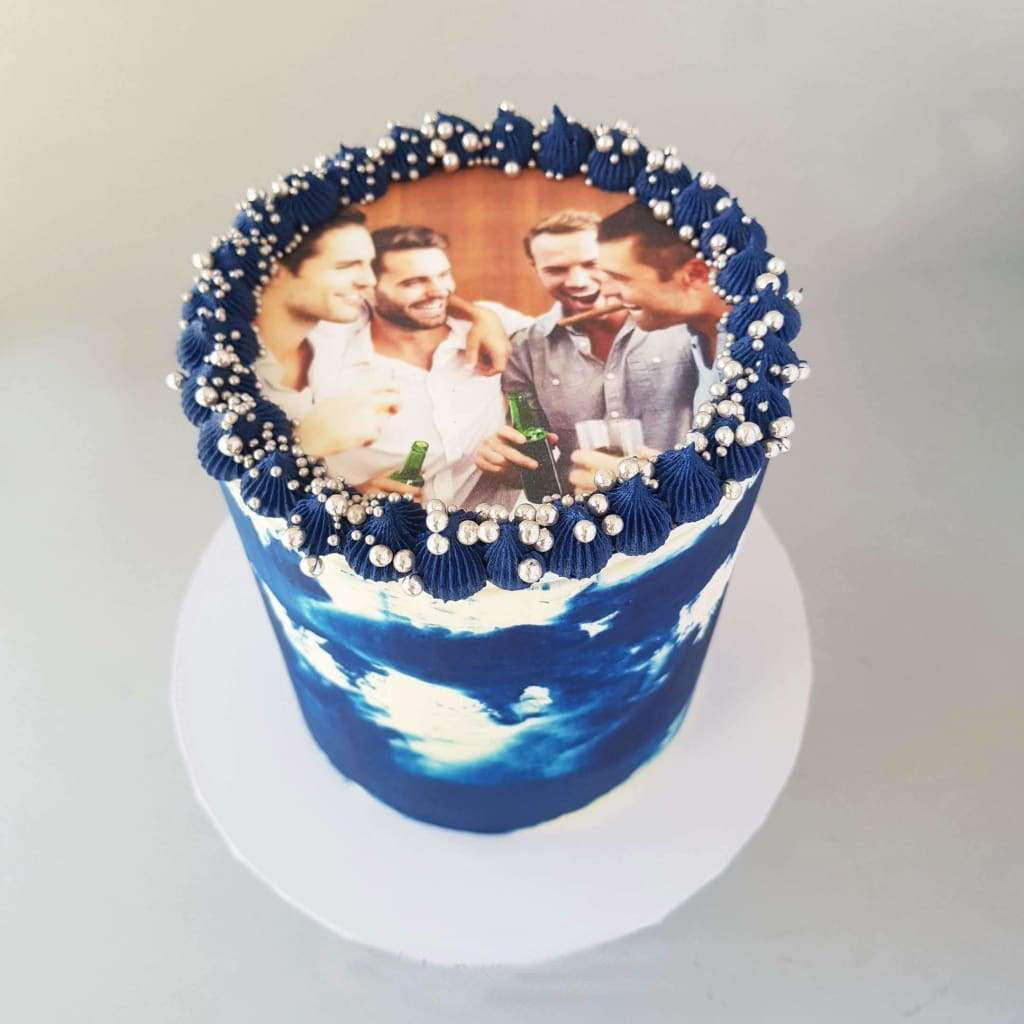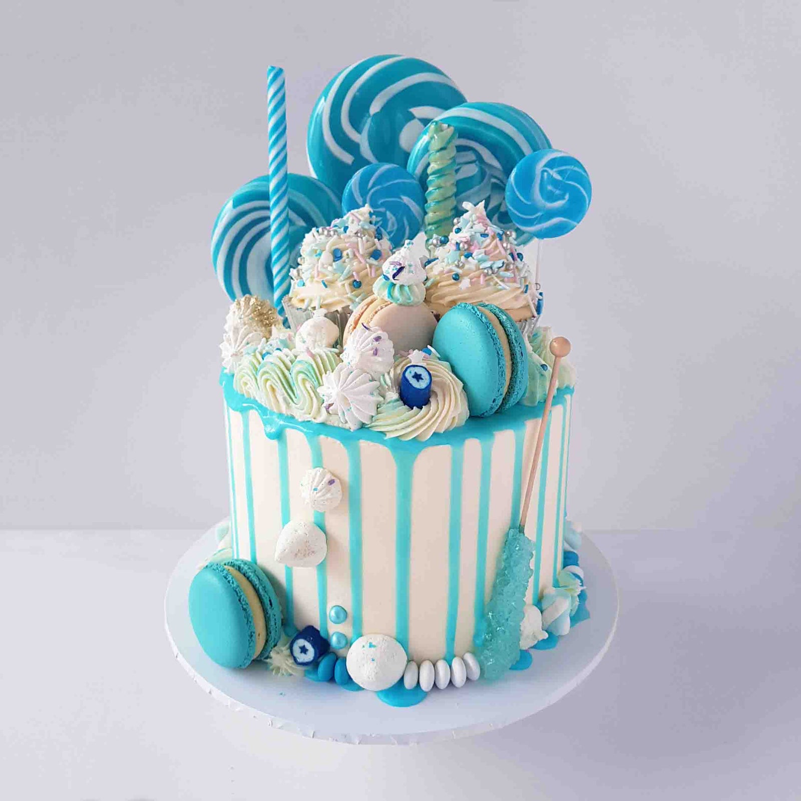 A butter sponge cake decorated with our award-winning icing is a sure winner. The cake is finished with blue drip icing, cupcakes, blue lollipops and candies, and other details to make it very clear who the cake is celebrating.