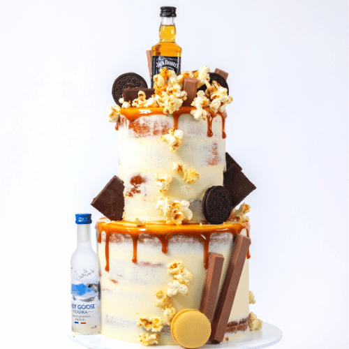 A real party cake, that is just calling to the men out there who like to really indulge! This is a rich cake, complete with chocolate, macarons, salted caramel popcorn, and french salted caramel drip, was designed with extravagance. The most unique part? The bottles of liquor that are added to the cake! This is perfect for the guy who loves to go all-out in his celebration.