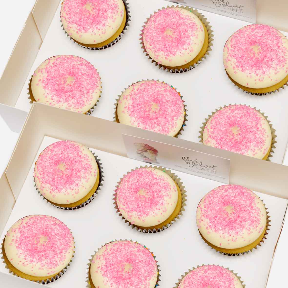 Our cupcake is vanilla flavoured and topped with pink sprinkles with vanilla icing. It is a great addition to any dessert table!
