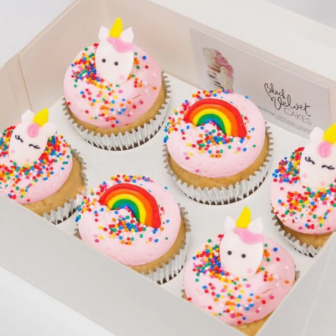 These cupcakes are vanilla flavoured with light pink icing and are decorated with edible unicorns and rainbows. They are also low in gluten, so they’re great for those with gluten allergies.