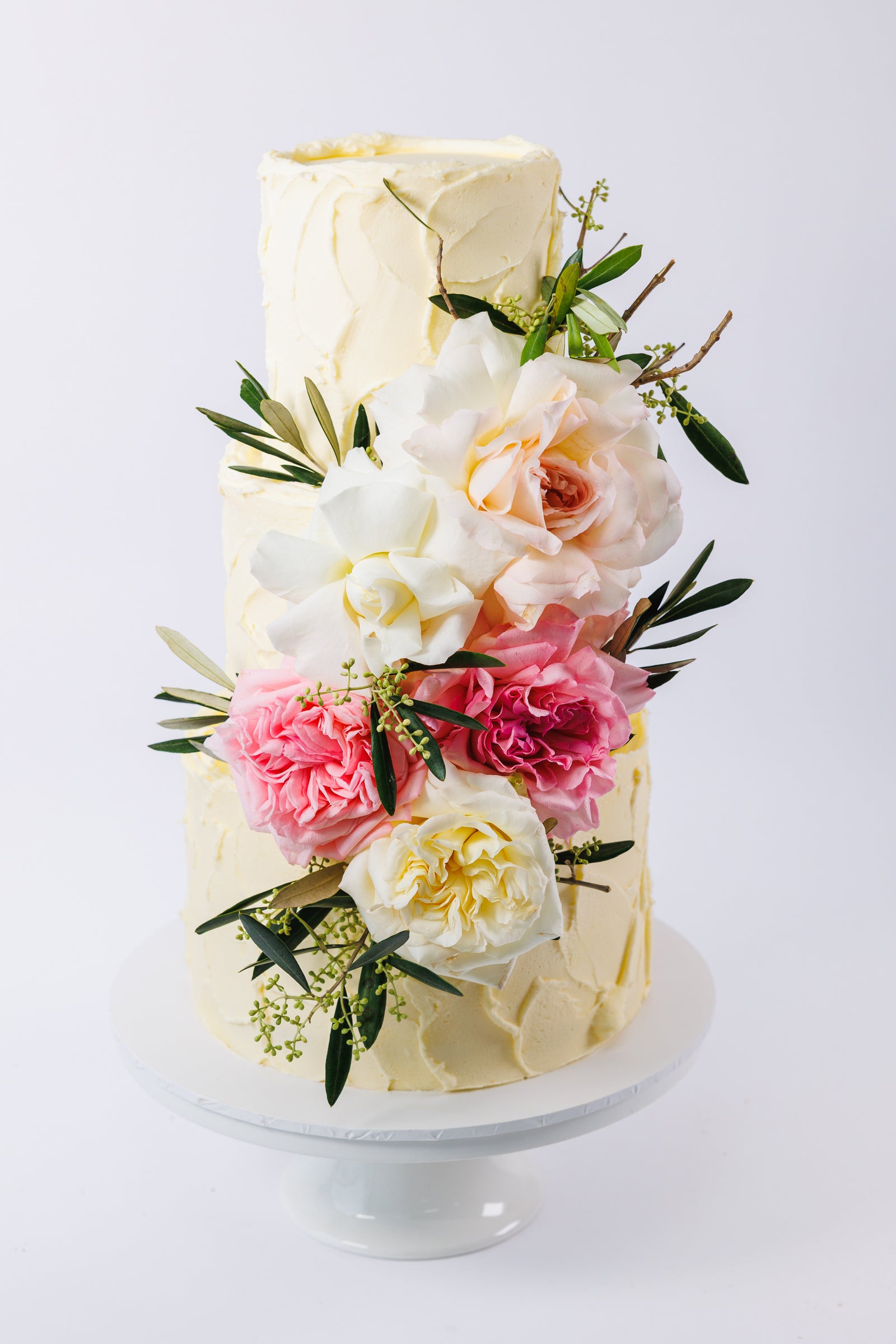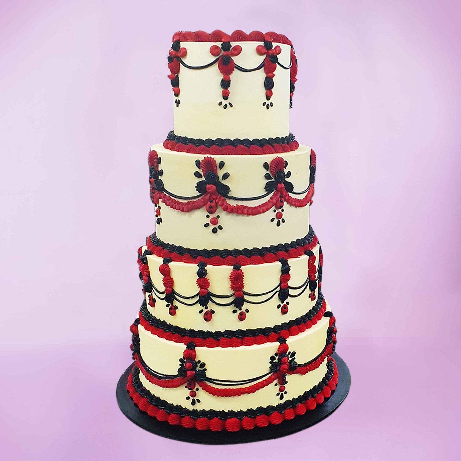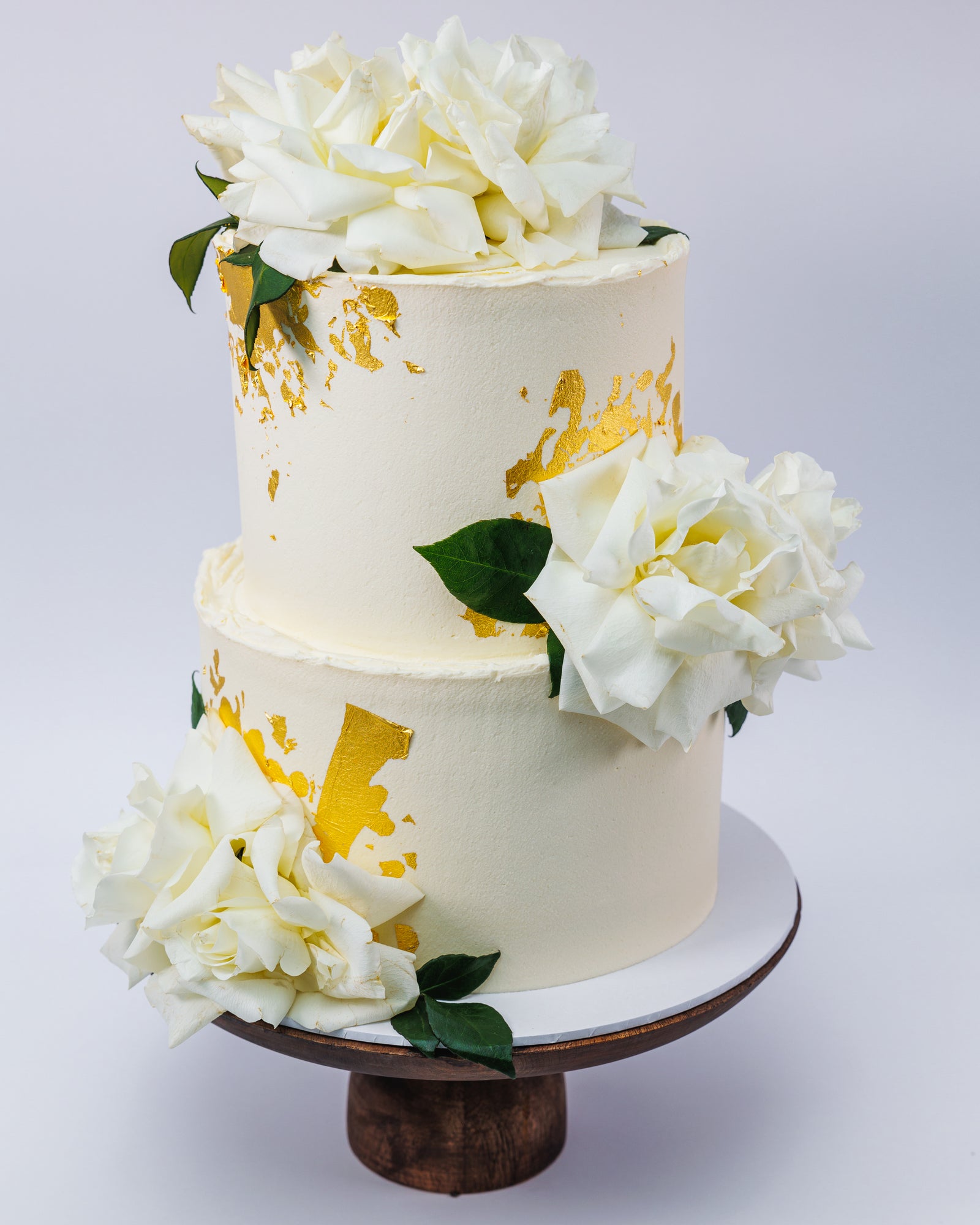 This masterpiece showcases four tiers adorned with exquisitely textured buttercream, forming a symphony of flavours and aesthetics. To add a touch of timeless sophistication, delicate white flowers are sparingly placed, making a strikingly elegant statement. When you order a four-tiered cake, we’ll make sure your wedding cake is a true work of art that will leave a lasting impression on your guests.