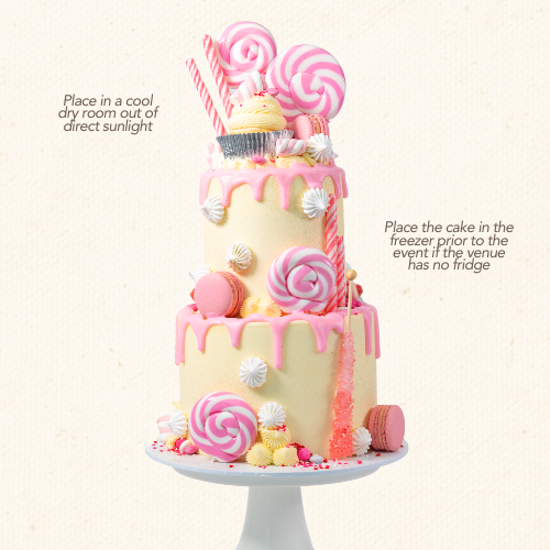 When a cake is on display it is best placed in a cool (preferably air conditioned) dry room out of direct sunlight or any heat source. If the cake is to be eaten at outdoors, it should be refrigerated to the point of display and almost immediate consumption. In the scenario the cake can’t be refrigerated (in a park, boat, etc), if you want an extended period of displaying the cake (out of sunlight) place the cake in the freezer for as long as possible before the event and keep observation on it maintaining its shape while on display. If it’s not looking its best, you know it’s time to serve immediately!