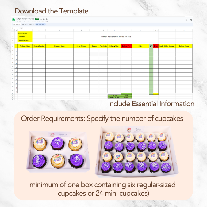 Are you looking to send delightful cupcakes, mini cupcakes or cakes to 5 or more locations? Let Black Velvet Cakes take the stress out of the process for you. We offer bulk order and multiple delivery quotes to ensure a smooth and cost-effective experience, and our reliable delivery service ensures your cake arrives fresh and on time within a convenient two-hour, four-hour and all-day windows. We offer attractive incentives for volume orders, no matter if the campaign is to be executed in a day or throughout the entire year.