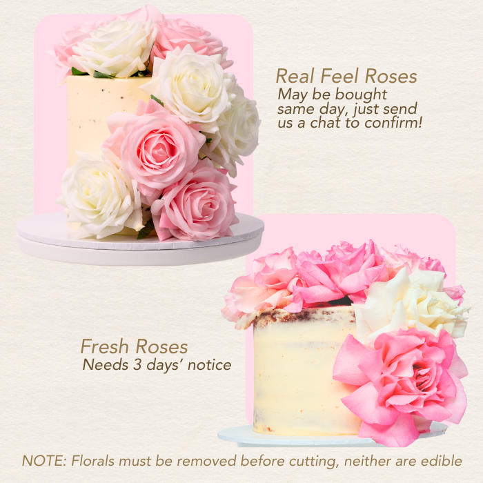 Enhance your cakes with the stunning allure of both lifelike roses and freshly picked blooms. Our lifelike roses offer a touch of sophistication, remaining pristine without wilting, and are readily available for same-day orders, ensuring your confections are always adorned with perfection.