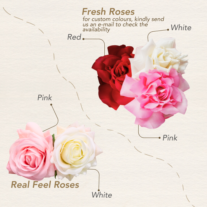 For fresh florals, these may vary depending on what's available on the market. Alternatively, our customers usually opt for our Real Feel Roses (pink or white) instead, for $5 each.
